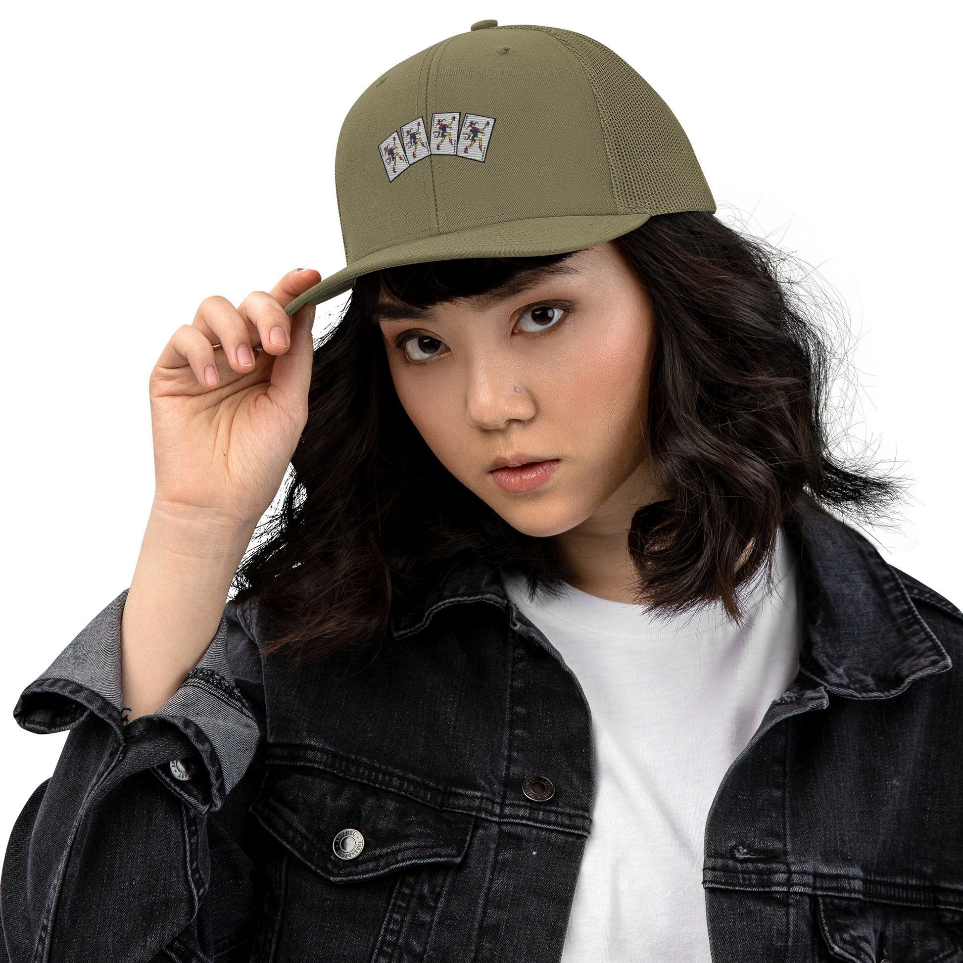 Complete your outfit with an embroidered trucker cap—combine it with a sports tee, slacks, and comfy shoes. It has a classic structured fit, adjustable plastic snapback, and a curved visor that matches its underbill.